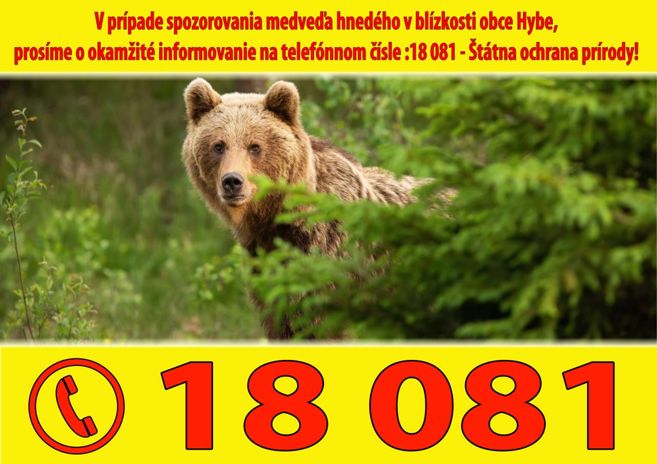 v prípade spozorovania medveďa hnedého v blízkosti obce Hybe volajte na tel. číslo 18081